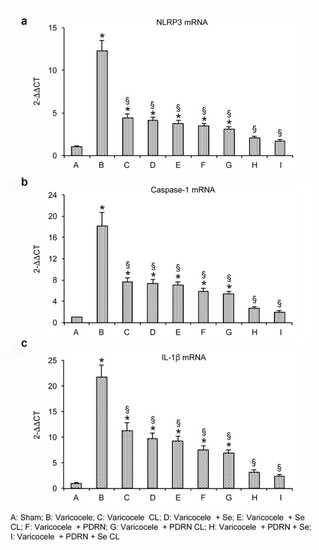 Real-time PCR analysis for NLRP3 (a), caspase-1 (b) and IL-1β (c) in the testes from rats of sham, varicocele, varicocele contralateral, varicocele plus Se (0.4 mg/kg/day i.p.), varicocele plus Se contralateral, varicocele plus PDRN (8 mg/kg/day i.p.), varicocele contralateral plus PDRN, varicocele plus Se plus PDRN, varicocele contralateral plus Se plus PDRN groups. * = p < 0.05 versus sham; § = p < 0.05 versus varicocele. Bars represent the mean ± SE of 7 experiments.