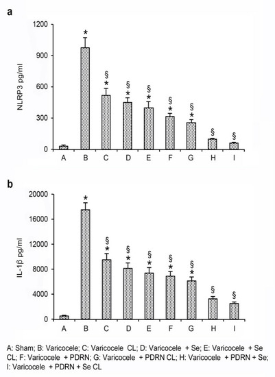 Quantitative evaluation of NLRP3 (a) and IL-1β (b) levels in the testes from rats of sham, varicocele, varicocele contralateral, varicocele plus Se (0.4 mg/kg/day i.p.), varicocele plus Se contralateral, varicocele plus PDRN (8 mg/kg/day i.p.), varicocele contralateral plus PDRN, varicocele plus Se plus PDRN, varicocele contralateral plus Se plus PDRN groups. * = p < 0.05 versus sham; § = p < 0.05 versus varicocele. Bars represent the mean ± SE of 7 experiments.