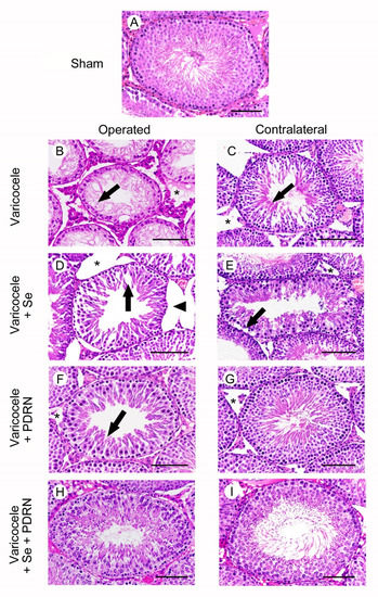 Structural organization of testes from rats of sham, varicocele, varicocele contralateral, varicocele plus Se (0.4 mg/kg/day i.p.), varicocele plus Se contralateral, varicocele plus PDRN (8 mg/kg/day i.p.), varicocele contralateral plus PDRN, varicocele plus Se plus PDRN, varicocele contralateral plus Se plus PDRN groups. (A): In sham testes, the seminiferous tubules have normal morphology. (B): Varicocele rats. The seminiferous epithelium shows reduced thickness with spermatogonia arranged on 1–2 rows and residual condensed sperm tails (arrow). In the extratubular compartment, a marked edema is evident (*). (C): Contralateral testes of the same group. The seminiferous tubules show many elongated spermatids (arrow). The extratubular compartment is edematous and hyperemic (*). (D): In varicocele operated rats treated with Se, the seminiferous epithelium is detached from the basement membrane (arrowhead) and many large clefts are present in its wall (arrow). The extratubular compartment is enlarged (*). (E): In the contralateral testes of the same group, peripheral spermatogonia are often detached from the basement membrane (arrow). The extratubular compartment shows hyperemic blood vessels and edema (*). (F): Varicocele operated rats treated with PDRN. The seminiferous epithelium shows intercellular clefts among round or elongated spermatids (arrow). A mild edema is present in the extratubular compartment (*). (G): Contralateral testes of the same group. The seminiferous epithelium has many elongated spermatids and mature spermatozoa; the extratubular compartment shows only a mild edema (*). (H,I): In the seminiferous tubules of both operated and contralateral testes of varicocele rats treated with Se plus PDRN, the seminiferous epithelium is close to normal. (Scale bar = 50 µm).