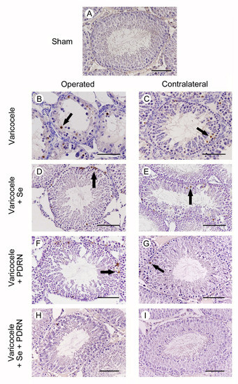 Assessment of apoptosis in the testes with TUNEL staining technique from rats of sham, varicocele, varicocele contralateral, varicocele plus Se (0.4 mg/kg/day i.p.), varicocele plus Se contralateral, varicocele plus PDRN (8 mg/kg/day i.p.), varicocele contralateral plus PDRN, varicocele plus Se plus PDRN, varicocele contralateral plus Se plus PDRN groups. (A): In sham rats, no TUNEL positive cells can be observed. (B): In the testes of varicocele rats, a large number of TUNEL-positive germ cells (arrow), placed along the wall of the tubules, are observed. (C): In the contralateral testes of the same rats, some isolated TUNEL-positive germ cells are present in the peripheral part of the seminiferous tubules (arrow). (D): In varicocele rats treated with Se, many TUNEL-positive cells are present in the periphery of the seminiferous tubules (arrow). (E): In the contralateral testes of the same group, some TUNEL-positive cells are located in the external part of the tubules (arrow). (F): In the testes of varicocele rats treated with PDRN, the number of TUNEL-positive cells is reduced, and they are located along the peripheral part of the tubules (arrow). (G): In contralateral testes of the same group, only a few TUNEL-positive cells (arrow) are present in the seminiferous epithelium. H, I: In the seminiferous tubules of both operated and contralateral testes of varicocele rats treated with Se plus PDRN, very rare or no TUNEL-positive cells are observed. (Scale bar: 50 µm).