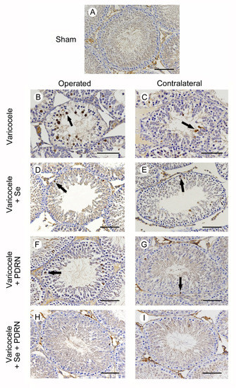 All animals of sham groups showed the same morphology when caspase-1 activity was evaluated. As a consequence, for the clarity of results, only one image is provided as representative of sham (Figure 5A) and a single datum is provided for caspase-1 positive cells (Table 3). No caspase-1 positive cells were detected in the seminiferous tubules of sham animals (Figure 5A; Table 3). In varicocele rats, a large number of caspase-1 positive cells were located in the highly damaged wall of the tubules (Figure 5B; Table 3). The number of caspase-1 positive cells was significantly reduced in the contralateral testes of the same rats (Figure 5C; Table 3). On the contrary, in varicocele rats treated with Se, many caspase-1 positive cells were present in the periphery of the seminiferous tubules (Figure 5D; Table 3). In the contralateral testes of the same group, some caspase-1 positive cells were present in the external part of the tubules (Figure 5E; Table 3). In the testes of varicocele rats treated with PDRN, a reduced number of caspase-1 positive cells were located along the periphery of the tubules (Figure 5F; Table 2). In the contralateral testes of the same group, only isolated caspase-1 positive cells were present (Figure 5G; Table 3). In the seminiferous tubules of both operated and contralateral testes of varicocele rats treated with Se plus PDRN, very rare or no caspase-1 positive cells were demonstrated (Figure 5H,I; Table 3).