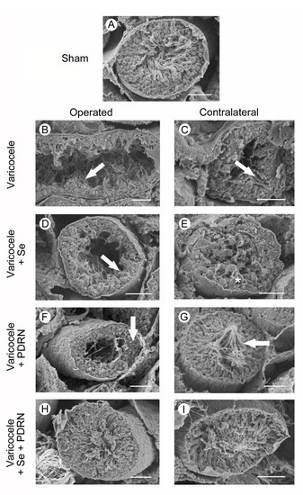 All groups of sham animals showed the same morphology as the SEM. For this reason, for the clarity of results, only one image is provided as representative of sham. In sham animals, the structure of the seminiferous tubules was normal (Figure 6A). In varicocele rats, tubules showed a reduced height of the seminiferous epithelium and condensed sperm tails (Figure 6B). The seminiferous tubules of the contralateral testes of the same group showed some clefts in the epithelium (Figure 6C). In varicocele rats treated with Se, the seminiferous epithelium was low and irregularly arranged (Figure 6D). In the contralateral testes of the same group, only few spermatozoa could be observed (Figure 6E). In the testes of varicocele rats treated with PDRN, the epithelium was higher (Figure 6F). In contralateral testes of the same group, the tubular morphology was well preserved, with evident spermatozoa (Figure 6G). In both operated and contralateral testes of varicocele rats treated with Se plus PDRN, tubules showed close to normal size and organization (Figure 6H,I).