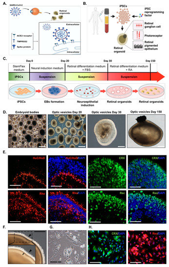 Coronaviruses are single-stranded RNA viruses that can infect various animals, resulting in enteric, hepatic, and neurological disorders at various severity levels [1]. In late 2019, the outbreak of coronavirus disease 2019 (COVID-19) largely ravaged the world economy and healthcare system, and scientists have identified severe acute respiratory syndrome coronavirus 2 (SARS-CoV-2) as the causative pathogen of COVID-19. To date, the global COVID-19 cases have surpassed 78 million, and the reported deaths are more than 1.7 million, with rising morbidity and mortality. Coronavirus entry into host cells is predominantly mediated by a spike (S) protein that forms homotrimers protruding from the viral surface [2]. The S protein of SARS-CoV-2 binds to its host receptor, angiotensin-converting enzyme 2 (ACE2), and the viral entry is subsequently primed by the protease of transmembrane serine protease 2 (TMPRSS2), another essential protein required for the fusion of the viral membrane with the host cell membrane [3]. Although the respiratory system is widely accepted as the primary organ for SARS-CoV-2 infection, recent studies have identified cells from other organs that may also be infected by SARS-CoV-2, e.g., blood vessel cells, kidney cells, brain cells, liver cells, and cardiomyocytes [4,5]. For example, the RNA-seq data showed the expression of ACE2 in different cell populations of the kidney organoids, including tubular-like cells and podocytes-like cells [4]. Hao et al. also identified ACE2 expression in oral cavity mucosa, especially in the tongue’s epithelial cells compared to other oral sites [6]. Sang et al. and Jacob et al. demonstrated that the SARS-CoV-2 pseudovirus can successfully infect the nervous system, induced pluripotent stem cell (iPSC)-derived neural cells, and brain organoids [7,8]. Another group reported ACE2 expression in the human cornea and conjunctiva [2]. Furthermore, SARS-CoV-2 was also detected in the postmortem retinal specimens from COVID-19 patients [9]. However, whether the human retina is susceptible to SARS-CoV-2 infection remains unclear.