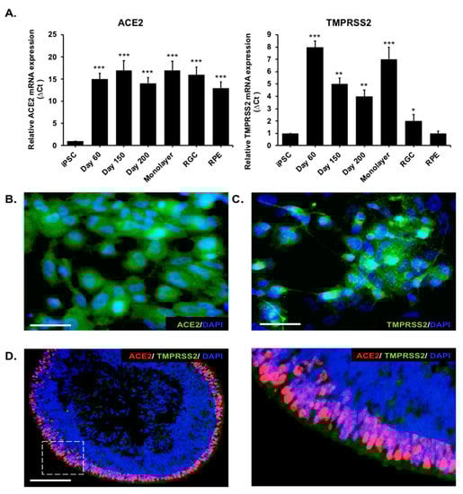 Analysis of angiotensin-converting enzyme 2 (ACE2) and transmembrane serine protease 2 (TMPRSS2) expressions on human iPSC-derived retinal organoids and monolayer cultures. (A) qPCR showing the ACE2 and TMPRSS2 gene expressions in retinal organoids (Day 60, Day 150, and Day 200); monolayer cultures; retinal ganglion cells (RGCs); and pigmented epithelium cells (RPEs). The expression of the housekeeping glyceraldehyde-3-phosphate dehydrogenase (GAPDH) gene was used for normalization. * p < 0.05, ** p < 0.01, and *** p < 0.001, and error bars are the standard deviation. (B) Immunofluorescence analysis of monolayer cultures with anti-ACE2. ACE2 expression was analyzed in monolayer cultures and stained in green at the cell membrane. Nuclei was stained positive for DAPI (blue). Scale bar, 50 µm. (C) The expression of TMPRSS2 (green) in the monolayer cultures. Cell nuclei was stained positive for DAPI. (D) The expression and localization of ACE2 and TMPRSS2 in Day-150 retinal organoids were evaluated by an immunofluorescence analysis. The area with ACE2 expression was stained in red and, with TMPRSS2 expression, stained in green. Nuclei were stained positive for DAPI. Right subpanel represents the boxed region of the image in the left subpanel with high magnification.
