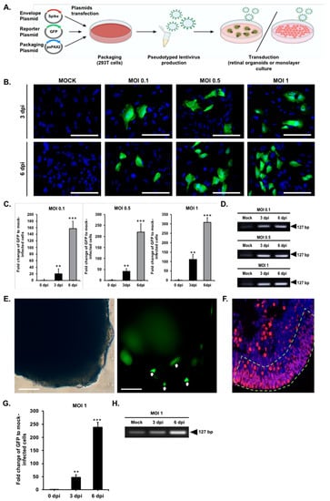 To determine the susceptivity of human iPSC-derived retinal organoids and monolayer cultures to SARS-CoV-2 infection, the SARS-CoV-2 pseudovirus was constructed and used to mimic the SARS-CoV-2 viral entry into the host cells (Figure 3A). The SARS-CoV-2 pseudovirus was constructed via transfecting 293T cells with a lentiviral backbone plasmid encoding a fluorescent reporter protein and the SARS-CoV-2 spike (S) protein [38,39]. We subjected retinal organoids (day 150) and monolayer cultures for the SARS-CoV-2 pseudovirus infection to multiplicities of infection of 0.1, 0.5, 1 [40], and uninfected, which was used as the control group (Figure 3B). Since a lentiviral expression vector was used to generate the pseudovirus containing the GFP coding sequence, infection of the cells with the SARS-CoV-2 pseudovirus can be monitored by detecting the GFP signal [41,42]. At three and six days post-infection (dpi), the monolayer cultures were analyzed for viral entry by detecting the GFP signal and counterstained with DAPI to stain the cell nuclei. The observation of the GFP-positive cells indicated that the monolayer cultures were susceptible to the SARS-CoV-2 pseudovirus infection. SARS-CoV-2 pseudovirus genome replication was monitored on days three and six post-infection (dpi) at three different multiplicities of infection [40] (i.e., MOI 0.1, MOI 0.5, and MOI 1). The samples were harvested at three and six dpi after infection and further subjected to qPCR (Figure 3C) and RT-PCR for examining the presence of GFP RNA (Figure 3D). We further analyzed the location of the SARS-CoV-2 pseudovirus containing GFP on the monolayer cultures by double-immunofluorescent staining with anti-recoverin: photoreceptor marker and anti-HuC/HuD: neuron marker in the Supplementary Materials (see Figure S1). Along with the observations that the monolayer cultures expressed ACE2, the infection of the SARS-CoV-2 pseudovirus increased in an MOI-dependent manner.
