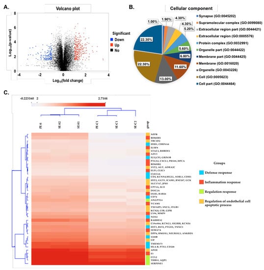 Next-generation sequencing (NGS) has recently been widely used in detecting the infectious strain mutation and biomolecular pathogenesis in the SARS-CoV-2 infection [43,44]. In this study, a transcriptome analysis was further conducted to explore the possible variations of the gene expression patterns in retinal organoids and monolayer cultures before and after the SARS-CoV-2 pseudovirus infection. We collected retinal organoids, infected monolayer cultures, and their corresponding uninfected-treated groups and detected their gene expressions to identify possible differentially expressed genes (Figure 4A). Next, we performed a gene oncology (GO) enrichment analysis to identify the upregulated genes associated with the cellular components (Figure 4B). We categorized both the up- and downregulated genes using Cluster 3.0 software and obtained an overview of the transcriptomic relationships (Figure 4C). Among all the differentially expressed genes in the retinal organoids and monolayer cultures, 10 genes (BDKRB1, BDKRB2, CXCL1, MMP9, F3, RARRES2, PTGS2, IL33, LY96, and VCAM1) were upregulated after the infection by the SARS-CoV-2 pseudovirus. Interestingly, most of these identified genes were closely associated with the inflammation response and endothelial cell apoptosis process. Collectively, the RNA-Seq and bioinformatic analysis revealed that genes related to the inflammation response and apoptosis pathway were upregulated in the SARS-CoV-2 pseudovirus-infected cells, similar to the findings reported in the lung endothelium and vascular tissues of COVID-19 infected people [32,45].