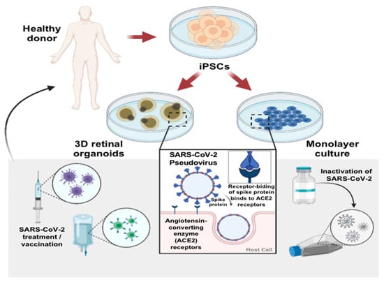 Induced pluripotent stem cell (iPSC) technologies and patient-derived iPSCs provide opportunities for regenerative medicine, drug discovery, and disease modeling from patient-derived stem cells, such as in cystic fibrosis, Huntington’s, Duchenne muscular dystrophy, Alzheimer, amyotrophic lateral sclerosis, age macular degeneration, and retinitis pigmentosa [10,11,12,13,14,15,16]. Although monolayer cultures are relatively easy to be cultivated, the features that they do not display, the complex tissue organization, limits their bioavailability. In contrast to monolayer cultures, 3D organoids can recapitulate the native histoarchitecture by forming an aggregation of different cell types that allows researchers to investigate the pathology mechanisms in the context of tissue organization microenvironment complexity [17]. Indeed, the applications of iPSC-derived organoids have been extended to basic biological research, medical research, and organ regeneration, such as iPSC-derived lung, brain, vascular, kidney, and retinal organoids [18,19,20,21,22]. Furthermore, human iPSC-derived retinal organoids have been utilized to model human-specific retinal development, disease progression, and drug testing [23]. A series of subsequent studies used human organoids for investigating viral infections such as the ZIKA virus, avian H7N2, and swine H1N1 [24,25]. Moreover, with the rise of global pandemic cases of COVID-19, many studies have used iPSCs as in vitro platforms for investigating the pathogenesis of the SARS-CoV-2 infection or the screening of antiviral drugs against SARS-CoV-2 [26,27,28,29,30].