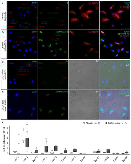 Expression of Eph receptors and illustration of ephrinA5-Fc binding sites in CB and DAOY cells. (a,b) CB cells were tested for binding of recombinant control-Fc (a) and recombinant ephrinA5-Fc (b), both clustered with an Alexa488 conjugated anti-human IgG antibody (green, second panel). CB cells were additionally stained using DAPI (blue, first panel) and an antibody directed against ß3-tubulin (red, third panel). The overlay of all channels is depicted in the fourth panel. (c,d) DAOY cells were treated with control-Fc (c) or recombinant ephrinA5-Fc (d), both clustered with an Alexa488 conjugated anti-human IgG (green, second panel). In addition to DAPI nucleus staining (blue, first panel), brightfield is depicted (third panel) as well as the overlay of all channels (fourth panel). (e) Quantitative real time PCR analysis of expression of EphA and EphB receptors depicted as fold enrichment relative to the reference genes Rps29 and RPS18 (n = 8 for CB cells and n = 12 for DAOY cells. N = 4 biological replicates). Scale bar: 50 µm.