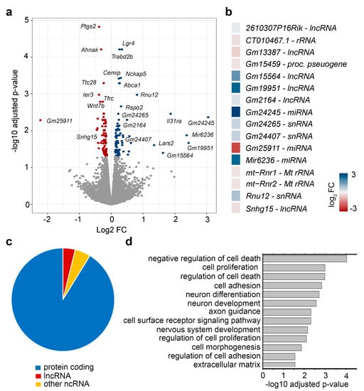 Differential gene expression analysis of ephrinA5-Fc-treated CB cells versus controls (Fc) determined by RNA sequencing of nuclear-enriched and ribosomal-depleted RNA. (a) Volcano plot illustrates the genes identified as significantly up- and down-regulated upon ephrinA5-Fc stimulation. The negative log10 of the adjusted p-value is plotted against the log2 fold change of each gene. Significantly up-regulated genes are depicted in blue, and significantly down-regulated genes are illustrated in red. Sequencing was performed as N = 3 biological replicates per condition. (b) Heatmap of differentially expressed non-coding RNAs. (c) Pie chart diagram depicting the proportions of protein-coding versus non-coding RNAs found as differentially expressed. (d) Bar plot depicting significant gene ontology terms for the differentially expressed genes after ephrinA5-Fc stimulation.