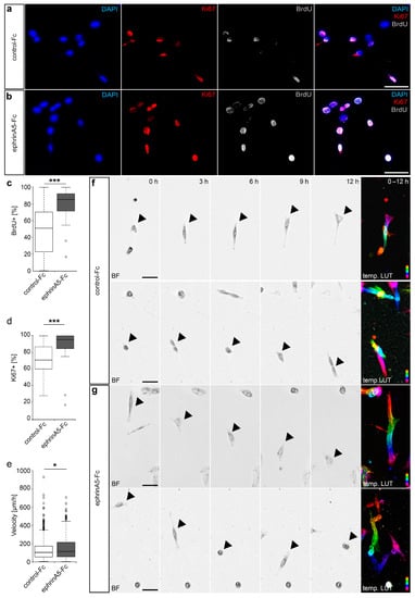 Next, we aimed to verify the observed transcriptional changes at a functional level by investigating the physiological responses of CB cells toward ephrinA5 stimulation. Based on the GO analysis and described functions of Eph/ephrins in the cancer-context, we here focused on analyzing the effects on CB cell proliferation and migratory activity. To determine whether ephrinA5-Fc impacts proliferation, we stimulated cells with pre-clustered ephrinA5-Fc for 5 h and then applied the thymidine analogue Bromodeoxyuridine (BrdU) for 1 h prior fixation. BrdU is incorporated in cells of the S-phase during the cell cycle, hence labelling dividing cells. Then, we performed an immunostaining using antibodies directed against BrdU and Ki67, another marker for mitotically active cells []. We found that ephrinA5-Fc stimulation leads to increased proliferation, reflected by elevated proportion of cells that incorporated BrdU, as well as by augmented proportions of Ki67 positive cells (Figure 3a–d).