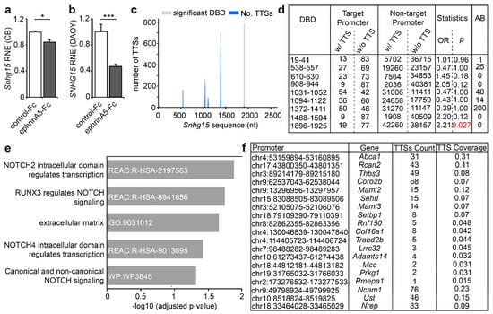 Following this hypothesis, we analyzed potential triplex target DNA sites (TTS) for Snhg15 in genes found differentially expressed upon ephrinA5-Fc stimulation by using the computational method triple helix domain finder []. Indeed, we determined in the Snhg15 lncRNA a DNA-binding domain (DBD) ranging from 1896 bp–1925 bp, corresponding to chromosomal location chr11:6530448-6530477 (Figure 4c,d, Supplementary File S1). This DBD displays significant binding to promoters of 19 genes found significantly up-regulated upon ephrinA5-Fc stimulation (Figure 4c,d). As Snhg15 itself was found down-regulated upon ephrinA5-Fc treatment (Figure 4a), we hypothesize that Snhg15 suppresses the expression of these genes upon promoter binding. As determined by functional profiling, these 19 genes show a significant enrichment of extracellular matrix-associated genes, such as Adamts14, Col16a1, Thbs3, Lrrc32, and Ncam1 (Figure 4e,f). All of these genes have been associated with tumorigenic processes including proliferation and migration regulation [,]. While the extracellular matrix is relevant for migration, Notch signaling regulates proliferation of neural stem cells [] and tumor cells [,]. Reactome analysis revealed a significant enrichment of Notch signaling pathways among the Snhg15 target genes (Figure 4e). Notch signaling is likewise implicated in diverse aspects of cancer biology [,]. Thus, ephrinA5 could modulate the transcription of cancer-related genes by acting on Snhg15 expression as a key lncRNA.