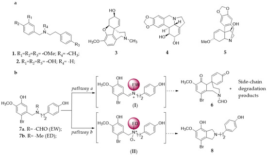 Recently, the use of N-formyl-2-bromo-O-methynorbelladine 7a in the total synthesis of 3 by a laccase (benzenediol: oxygen oxidoreductases, EC 1.10.3.2) [7]-mediator system has been reported, focusing on the formation of the spyrocyclohexadienone 6 as a tri-cyclic intermediate (Figure 1, Panel b) [8]. In this latter case, undesired side-products were produced depending on the nature of the N-substituent. Electron withdrawing group EW (R = CHO, 7a) favored the formation of phenoxy radicals and successive oxidative coupling, and the hydrolysis of the iminium ion (I) to side-chain degradation products was the only observed side-process [8,9] (Figure 1; Panel b, pathway a). Conversely, the oxidative coupling was not operative with electron-donating group ED (R = CH3, 7b), in which case the isoindoline 8 was produced by an iminium-ion Polonovski transformation of the N-oxide intermediate (II) (not isolated) [10,11] (Figure 1; Panel b, pathway b).