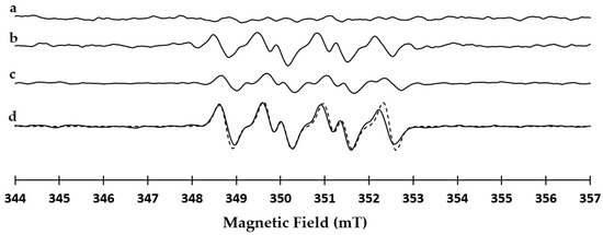 Compound 10 is reported to be the ring-opening product of 2-hydroperoxy-1,4-dioxane III (not isolated, Scheme 1) [39,40,41]. EPR studies with 5,5-dimethyl-1-pyrroline N-oxide (DMPO) confirmed the presence of III in the reaction mixture. As reported in Figure 2 (line a), 1,4-dioxane alone showed a tiny signal in the magnetic field range of 348–353 mT compatible with the formation of the III/DMPO-adduct. The intensity of this signal increased after the addition of laccase (line b). In addition, the same signal was detected during the oxidation of 7b with laccase (line c). The III/DMPO-adduct was common to all cases studied with increasing intensity after the addition of laccase. From a spectroscopic point of view, the spin-trapping approach allows to trap the first radical species formed in the reaction, and the increase of intensity of the signal at 348–353 mT confirms the role of 1,4-dioxane as co-oxidant in the oxidation.