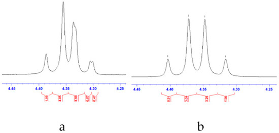 As a selected case of study, the 1H-NMR of 12b with chiral lanthanide shift reagent Eu(hfc)3 (700 µL MeOD, 13.9 mM Eu(hfc)3) [43] showed the expected asymmetric shift pattern of the AB quartet system (4.60–4.20 ppm) for the resolution of the two enantiomers, with an enantiomeric excess (ee) of 10% (Figure 4). Polarimetric analyses of 9, 12a–e and 12g–h are reported in Table 2.