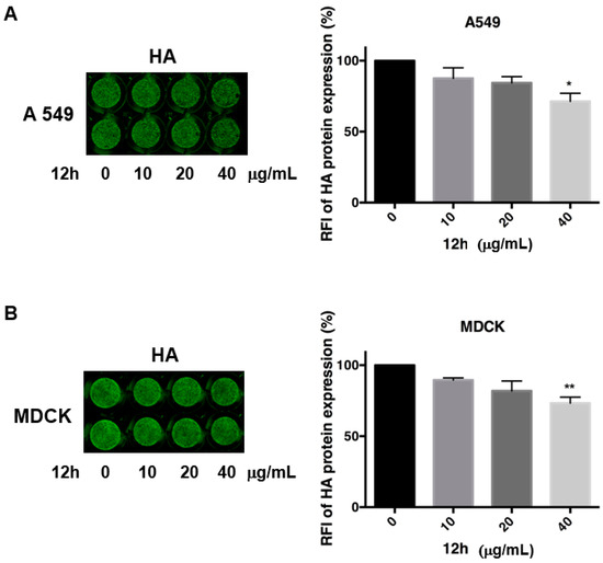 The expression of Hemagglutinin (HA) by means of In Cell Western (ICW) assay in the presence of most active compound 12h; panel (A): A549 cells were infected with PR8 and treated or not with different concentrations (0–40 μg/mL) of compound 12h. After 24 infection, cells were fixed and stained for HA protein, as described in the Materials and Methods section; panel (B): Supernatants were recovered and used to infect a fresh monolayer of MDCK (Madin-Darby canine epithelial kidney) cells. The expression of viral HA was analyzed by ICW assay, using LI-COR Image Studio Software. The percentage of relative fluorescence intensity (RFI) was calculated in comparison to untreated infected cells (considered 100%). Values are the mean ± S.D. of two replicates of one experiment of two performed (n = 2). Statistical significance of the data vs untreated infected cells was defined as * p < 0.05 and ** p < 0.001.