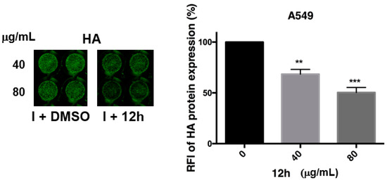The expression of Hemagglutinin (HA) by means of ICW assay at late steps of viral replication. A549 cells were infected with PR8 and treated or not with 40 or 80 μg/mL of compound 12h. After 24 infection, cells were fixed and stained for HA protein, as described in the Materials and Methods section. The expression of viral HA was analyzed by ICW assay, using LI-COR Image Studio Software. The percentage of relative fluorescence intensity (RFI) was calculated in comparison to untreated infected cells (considered 100%). Values are the mean ± S.D. of two experiments, each performed in duplicate (n = 4). Statistical significance of the data vs untreated infected cells was defined as ** p < 0.001 and *** p < 0.0001.