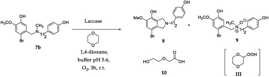 The Polonovski transformation [11] of amine N-oxides occurs by two successive steps: (a) the protonation of the quaternary N-oxide moiety [31,32]; and (b) the cleavage of the iminium ion to corresponding aminium radical cation, followed by α-hydrogen elimination and skeletal rearrangement [33,34]. In order to avoid the occurrence of the Polonovski reaction in the laccase catalyzed synthesis of belladine N-oxides, the critical reaction step was expected to be the protonation of the N-oxide moiety. We started our investigation using 7b (Scheme 1) as a model substrate (general procedures are in Supplementary Materials (SM) #1, and the synthesis of 7b in SM #2).