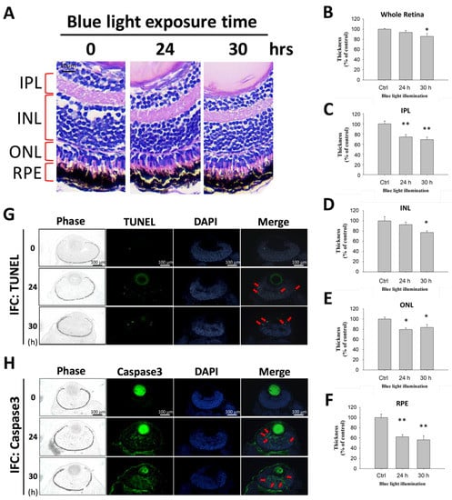 2.5. The Long-Term Effect of Blue Light Exposure on the Retina of Zebrafish Larvae