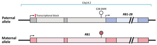 The schematic representation of RB1 imprinting (based on genome assembly GRCh38.p12). Unmethylated E2B-DMR on the paternal allele activates expression of RB1-2B, which acts as a roadblock for the regular RB1 transcript on the same allele, while methylation of E2B-DMR on maternal allele allows normal expression of RB1. Filled ellipse represents methylated E2B-DMR, and open ellipses represent unmethylated DMRs. Dark and light boxes indicate exons and introns of RB1 gene, respectively.