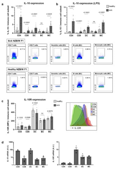 Disease-stage dependent expression of IL-10 and IL-10R on main immune cell populations in lupus-prone NZB/W F1 mice. (a–c) Splenocytes from 14 week old healthy (n = 12–13 mice) and 28 week old NZB/W F1 animals with established autoantibodies and beginning nephritis (sick; n = 12–13 mice) were (a) stimulated with PMA and ionomycin or (b) PMA, ionomycin and LPS and examined by flow cytometry for expression of IL-10 on CD4 and CD8 T cells, dendritic cells (DC), B cells (BC) and monocytic cells (MC). Representative FACS blots are shown and pooled results of three independent experiments depicted as scatter blots with mean ± SEM and with each data point representing an individual mouse. (c) IL-10R expression was determined on the respective cell subsets without additional stimulation. A representative histogram of the IL-10R mean fluorescence intensity (MFI) on the different subsets of 28 week old NZB/W F1 animals is shown and pooled results of three independent experiments depicted as scatter blots with mean ± SEM and with each data point representing an individual mouse. (d) CD4 and CD8 T cells, dendritic cells (DC), B cells (BC) and monocytic cells (MC) were sort-purified from unstimulated splenocytes of 28 week old NZB/W F1 mice to determine mRNA expression levels of IL-10 and IL-10R. Results are expressed as scatter blots with mean ± SEM; each data symbol represents an individual mouse. The p value was calculated using a Mann–Whitney test to determine the difference in the expression of IL-10 or IL-10R between healthy and diseased animals (a,b).