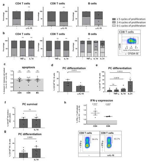 Cells (splenocytes or purified immune cells) were cultured in RPMI 1640 medium supplemented with 2 mM glutamine, 1% (v/v) nonessential amino acids, 1% (v/v) sodium pyruvate, penicillin (50 U/mL), streptomycin (50 μg/mL) (all from Life Technologies, Thermo Fisher Scientific, Freiburg im Breisgau, Germany), 10% (v/v) FBS (anprotec, AC-SM-0161, Bruckberg, Germany) and 55 μM 2ME (Sigma-Aldrich). To determine the influence of IL-10, 10 µg/mL neutralizing α-IL-10 antibodies (α-IL-10) (BioLegend, Koblenz, Germany, clone JES5-2A5) were added to splenocyte cultures or 10 ng/mL recombinant murine IL-10 (BioLegend), IL-21 or TNF-α (PeproTech, Hamburg, Deutschland) to cultures with purified cells. To examine in vitro proliferation, cultured cells were stained with CFDA-SE (Thermofisher). To analyze proliferation of B and T cells, as well as plasma cell differentiation of B cells, splenocytes or purified cells were cultured in the presence of 1 µg/mL CpG (ODN2006, InvivoGen, Toulouse, France) or plate-bound α-CD3/CD28 (2 µg/mL, BioLegend) for 4 days in the presence or absence of neutralizing α-IL-10. To explore the expression of Annexin V, cells were cultured for 48 h without further stimulation. The expression of co-stimulatory molecules in innate immune cell subsets or cytokine secretion in splenocyte cultures was determined in the presence or absence of LPS (100 ng/mL, E. coli O55:B5, Sigma-Aldrich) and Pam3CSK4 (100 ng/mL, InvivoGen, tlrl-pms). The expression of IFN-γ on CD4 and CD8 T cells was examined after 2 days stimulation using plate-bound α-CD3/CD28 (2 µg/mL, BioLegend) in the presence or absence of neutralizing α-IL-10, followed by re-stimulation with PMA/ionomycin/Brefeldin A for intracellular cytokine detection as outlined below.