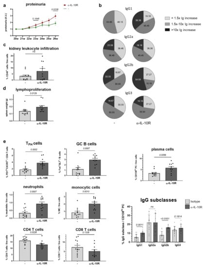 In vivo effects of α-IL-10R application on lupus pathology and immune status in NZB/W F1 animals. 20–22 week old NZB/W F1 animals with detectable α-dsDNA antibodies were treated with α-IL-10R or isotype control (n (α-IL-10R) = 11–13 mice; n (isotype) = 13 mice) at a dose of 500 µg every 3 weeks over 6 weeks. Clinical disease progression and impact on immunologic changes were determined by: (a) development of proteinuria depicted as trend line with mean ± SEM for each time point; (b) levels of α-dsDNA IgG1, IgG2a, IgG2b and IgG3 before and after treatment; indicated are the percentages of animals with an α-dsDNA titer increase >10×, of 1,5–10× and <1,5× as pie graph; (c) kidney infiltration by CD45+ leukocytes; (d) lymphoproliferation by splenomegaly; and (e) immune status evaluation using flow cytometry in spleen 1 week after termination of α-IL-10R or isotype treatment; depicted are relative changes in neutrophils, monocytic cells and CD4 and CD8 T cells, in CXCR5hiPD1hi TFH, FashiGL7hi GC B cells, CD138hi plasma cells and their expression of IgG1, IgG2a, IgG2b and IgG3. (a,c–e) The p value was calculated using a Mann–Whitney test to determine the difference between isotype- and α-IL-10R-treated animals. Results are expressed as scatter blots with mean ± SEM; each data point represents an individual mouse.