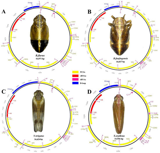 The complete mitogenomes of B. flavus (GenBank No.: MW281858; length: 16,053 bp), B. fanjingensis (GenBank No.: MW281859; length: 15,979 bp), Y. strigatus (GenBank No.: MW281860; length: 16,640 bp), and Y. erythrus (GenBank No.: MW281861; length: 15,922 bp) were identified as circular double-stranded molecules (Figure 1). They were of medium size compared to those of other species of the Fulgoroidea superfamily. Each newly sequenced mitogenome contained 37 typical mitochondrial genes (13 PCGs, 2 rRNAs, and 22 tRNAs) and an AT-rich region (Figure 1; Table 1). All four caliscelid planthoppers displayed an identical gene arrangement that was shared with the putative ancestral gene order [35,36]. Of the typical genes, 23, including 9 PCGs and 14 tRNAs, were encoded on the major strand (J-strand), whereas the remaining 14 genes, including 4 PCGs, 8 tRNAs, and 2 rRNAs, were encoded on the minor strand (N-strand).