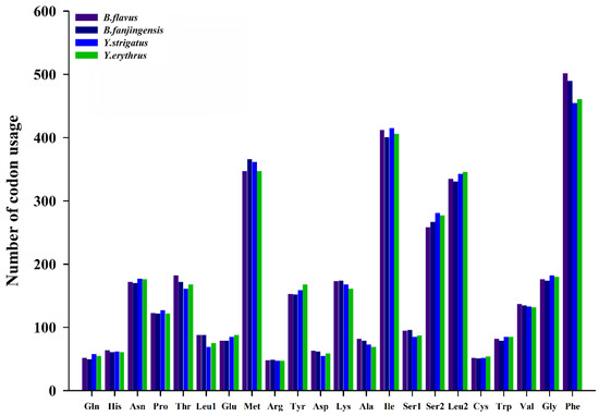Number of codon usages in the protein-coding genes of Bambusicaliscelis flavus, B. fanjingensis, Youtuus strigatus, and Y. erythrus mitogenomes. Each amino acid is denoted as a three-letter symbol according to the IUPAC-IUB three-letter amino acid codes.