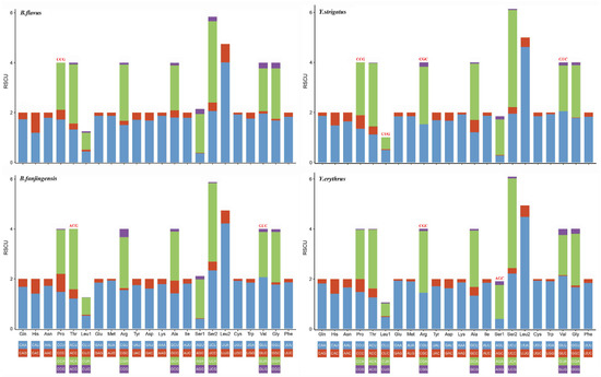 Relative synonymous codon usage in the protein-coding genes of Bambusicaliscelis flavus, B. fanjingensis, Youtuus strigatus, and Y. erythrus mitogenomes. Codon families are indicated below the X-axis. The color of the codon family below the X-axis corresponds to the color above the X-axis. The stop codon is not given. Codons absent in mitochondrial genomes are shown at the top of columns.