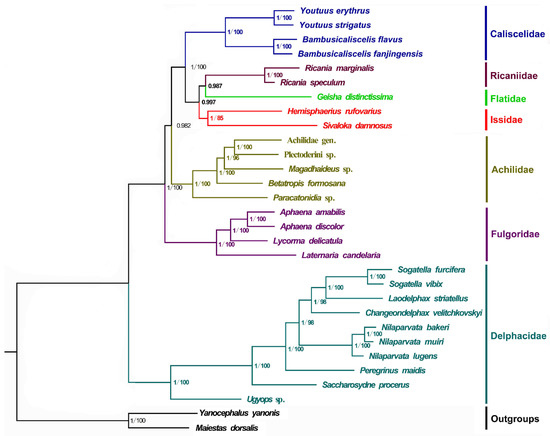 Phylogenetic trees of Fulgoroidea inferred using MrBayes (Bayesian inference) and maximum likelihood (ML) analysis based on the nucleotide sequences of the 13 protein-coding genes. Bayesian posterior probabilities (BPPs) and bootstrap percentage (BP) are indicated on branches; a BP below 75 is not shown.