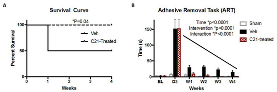It has been shown previously that C21 improves survival in males [5,13]. Furthermore, we have shown a tendency toward improvement of survival at 14 days in female Wistar rats [8]. To that end, survival was assessed in our current study. C21 significantly improved survival starting from week 1 through week 4 (Figure 1A). After assignment to treatment groups, there was no mortality in the C21 group, whereas 50% of animals assigned to the vehicle group experienced further mortality. In addition, C21 significantly lowered the time to remove the adhesive tape, indicating improvement of fine sensorimotor function. There was no difference in the latency to remove the adhesive tape before stroke, and notably both groups displayed equivalent levels of stroke severity, indicated by their similar day 3 measurements prior to vehicle and C21 treatment assortment (Figure 1B).