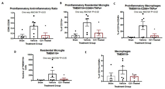 C21 may exert its beneficial effects on stroke recovery through modulation of the pro-/anti-inflammatory microglia ratio in diabetic animals. (A) Treatment with C21 lowered the M1:M2 ratio in female diabetic rats 4 weeks after stroke (p = 0.03). C21 administration lowered both the (B) M1 residential microglia and the (C) M1 macrophages (p = 0.02). One-way ANOVA (n = 5–6/group). (D) Delayed administration of C21 may act through halting the activation of residential microglia (p = 0.05). (E) It also did not impact the percentage of activated macrophages as measured by flow cytometry, as indicated in Table 1. It did however reduce the activation of residential microglia. One-way ANOVA (n = 5–6/group).