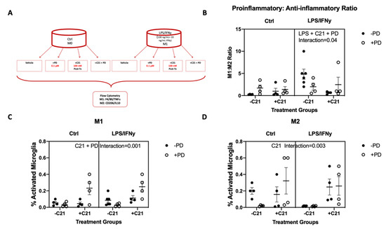 To determine if C21 induces an anti-inflammatory phenotype by directly acting on microglia, the C8B4 microglial cell line was treated with C21 in vitro (Figure 4A). Treatment with LPS/IFNγ resulted in an increased ratio of proinflammatory/anti-inflammatory markers (Figure 4B). Delayed C21 treatment 6 h post-LPS/IFNγ exposure at a dose of 100 mM decreased the M1:M2 ratio only in the absence of AT2R blockage with PD (interaction p = 0.004). C21 treatment did not alter the M1 cells, but increased the M1:M2 ratio by increasing M2 microglia (interaction p = 0.003; Figure 4C,D). PD blockage in C21 treatment halted the impact of C21 on the M1:M2 ratio by increasing the M1 microglia without altering the M2 ratio (interaction p = 0.001; Figure 4C,D).
