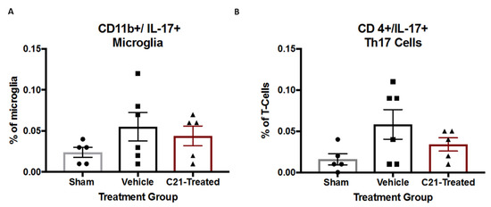 C21 did not alter IL-17 levels in the ischemic hemisphere. (A) C21 administration did not alter IL-17-producing microglia (Iba1+/Il-17+). (B) C21 did not alter CD4+/Th17 cells. One-way ANOVA (n = 5–6/group).