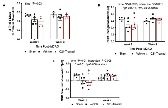Our lab and others have reported that HFD/STZ-induced diabetes results in cognitive impairment in female rats [5,6,14,15,16,17]. We also reported that delayed administration of C21 in male rats preserves cognition post-stroke [5,9]. To study the impact of stroke and C21 on cognition in diabetic females, both spatial memory and recognition memory were assessed using 2-trial Y-maze and novel object recognition (NOR) tests, respectively (Figure 6A,B). A decline in memory was observed in weeks 1 and 2 post-stroke as measured via Y-maze and NOR, respectively, yet no notable differences between vehicle- and C21-treated groups were observed. No memory impairment was observed at weeks 3 and 4 in either group.