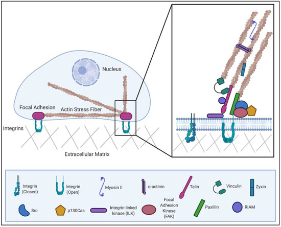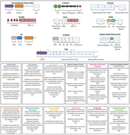 This review will primarily focus on a subset of the most well-characterized molecular components that comprise a focal adhesion, including the proteins FAK, Src, integrin-linked kinase (ILK), paxillin, p130Cas (Crk-associated substrate), Rap1-interacting adapter molecule (RIAM), talin, vinculin, α-actinin and zyxin. In order to perform their role in signal transduction, FA complexes must adopt the correct multi-protein structural arrangement. For this reason, FA proteins are often classified as either adaptor proteins which facilitate protein interactions or signaling proteins which exhibit enzymatic activity. However, these categorizations are not mutually exclusive, as there are many proteins which have both catalytic activity and protein-binding domains. Kinases (e.g., FAK, Src and ILK) are examples of catalytic proteins, albeit with different substrate specificity. FAK and Src are tyrosine kinases and represent two of the major protein kinases present within FAs [17]. Both are notable for their ability to recruit and phosphorylate proteins within the adhesion [18]. ILK is a serine/threonine protein kinase that regulates protein–protein interactions and is an important partner of the β1 integrin cytoplasmic domain [19]. Adaptor proteins fulfill their function through a variety of protein-binding domains commonly found within FA proteins. Some proteins contain more than one type of domain, which contributes to the varied protein–protein interactions observed at FA sites. The protein domain structures for the proteins discussed within this review, along with a brief summary of common domain functions, are provided in (Figure 2).