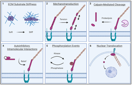 Simplified schematic depicting the FA-regulatory mechanisms discussed within this review. (1) ECM substrate stiffness: stiff substrate stimulates cell spreading and increases the average size of FAs. (2) Mechanotransduction: actomyosin contractility can promote protein unfolding and expose protein-binding sites. (3) Proteolytic cleavage: proteases such as the calpain family can cleave FA proteins. (4) Autoinhibitory interactions: protein activity can be regulated by intramolecular interactions wherein protein-binding sites are masked or exposed following relief of an autoinhibitory conformation. (5) Post-translational modifications: tyrosine phosphorylation is a key mediator of signal transduction at focal adhesions. (6) Nuclear translocation: several FA proteins have been shown to shuttle to the nucleus.