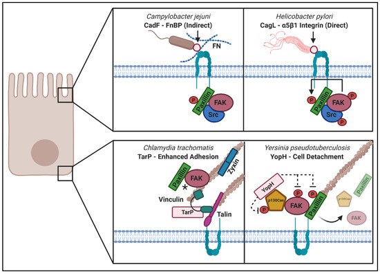 Clearly, changes to the ECM, transduced through integrin receptors, can influence FA dynamics. This same ECM–integrin–FA signaling axis is also relevant in the context of infectious disease. Pathogens interact with the ECM in order to adhere to and infect tissues. In fact, intracellular invasion is a critical occurrence leading to the virulence of many bacterial species. Host cell invasion is reliant upon proper adherence by the pathogen to the host cell surface, as well as induction of the requisite actin remodeling to promote bacterial uptake. Integrin receptors function at the nexus of ECM proteins and intracellular FA host cell signaling. Given the linkage between FAs and actin stress fibers, integrin-initiated signaling events also have the capacity to trigger downstream actin cytoskeletal rearrangement. Therefore, it is unsurprising that a common theme among pathogens during invasion is integrin engagement. In addition to facilitating bacterial attachment, this engagement can trigger early signaling events, such as inducing the recruitment or phosphoregulation of integrin-associated FA proteins [251].