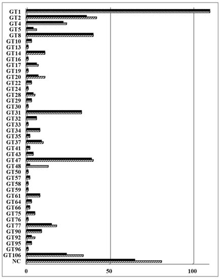 3.2. Evolution of GTs Correlated with Their Enzymatic Functions