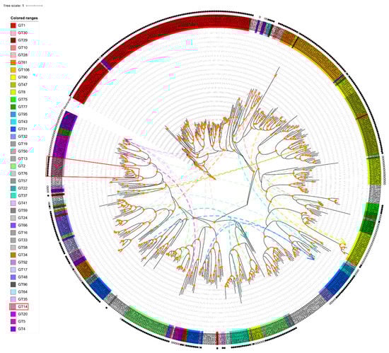 - Letunic, I.; Bork, P. Interactive tree of life (iTOL) v4: Recent updates and new developments. Nucleic Acids Res. 2019, 47, W256–W259. [Google Scholar] [CrossRef]