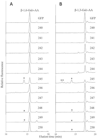 - Wu, Y.; Williams, M.; Bernard, S.; Driouich, A.; Showalter, A.M.; Faik, A. Functional identification of two nonredundant Arabidopsis α(1,2)fucosyltransferases specific to arabinogalactan proteins. J. Biol. Chem. 2010, 285, 13638–13645. [Google Scholar] [CrossRef]