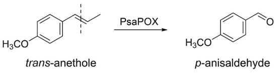 Alkene cleavage of trans-anethole into p-anisaldehyde by the dye-decolorizing peroxidase PsaPOX.