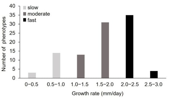 Distribution of vegetative growth rate of the P. sapidus monokaryons grown on standard nutrient liquid (SNL) agar plates. The strains were categorized as slow-, moderate-, and fast-growing strains according to the growth rate.