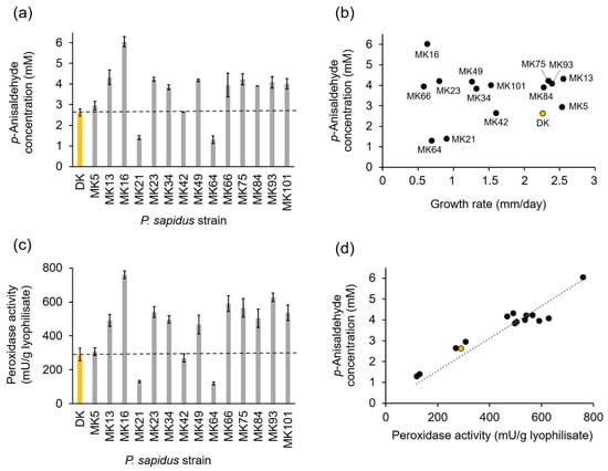 The cleavage of trans-anethole into p-anisaldehyde by the parental P. sapidus strain was the result of the activity of the DyP-type peroxidase PsaPOX []; therefore, the peroxidase activity of the monokaryons was determined in addition to the alkene cleavage activity. As expected, the peroxidase activity also varied between the strains (Figure 3c) and correlated well with the ability to cleave trans-anethole (Figure 3d, coefficient of determination R2 = 0.82).