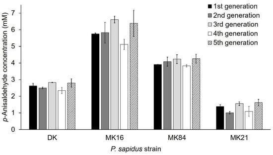 Phenotypic instability of dikaryons during long-term cultivation resulting in altered properties, such as the growth rate, is known in the literature and is caused by genetic exchanges and recombination between the nuclei of the dikaryon []. In contrast, the growth rate of haploid monokaryons of Schizophyllum commune [] and laccase and carotene degrading activity of monokaryotic P. ostreatus strains [] were stable over serial propagation for several months. However, only a few studies concerning the long-term stability [,,], especially regarding the production of enzymes [] in monokaryons and dikaryons, were published. For this reason, the phenotypic stability regarding alkene cleavage activity was exemplarily examined with trans-anethole for the parental dikaryon (activity group II, see Section 2.1.2) and three monokaryons (activity group I (MK21), III (MK84), IV (MK16)) over five sequential generations. Sub-cultivation to the fifth generation did not influence the ability to cleave trans-anethole within any of the strains (Figure 4, variance among the replicate lines was between 4–18%). Thus, the observed variability between the strains was stable. This is the second study that proved the stability of an enzyme activity for basidiomycetous monokaryons and the parental dikaryon during serial propagation over several months [].