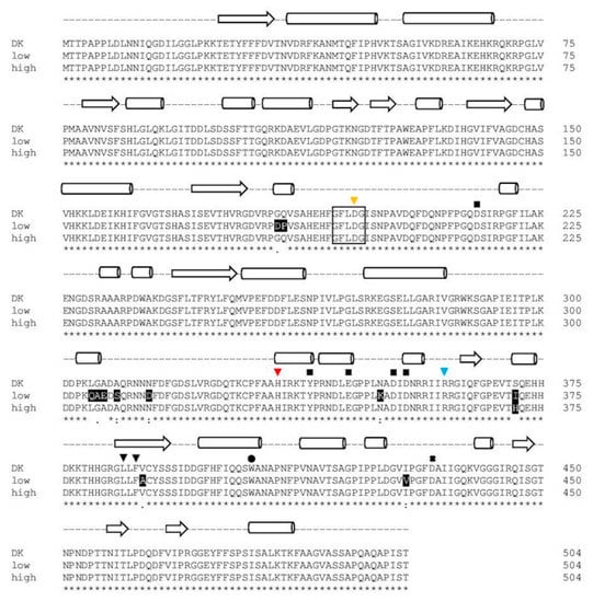 Alignment of the amino acid sequence of the PsaPOX variants. DK: PsaPOX_DK; low: PsaPOX_low; high: PsaPOX_high. Inverted triangles show amino acids important for heme binding (H334 (red) functions as ligands for heme and the four other amino acid residues form a hydrogen peroxide binding pocket). Aspartic acid (D433), which forms a hydrogen bond with histidine to stabilize compound I (oxidized heme after transfer of two electrons to H2O2), is indicated by a cross. The black box indicates the GXXDG motif containing the catalytic aspartic acid residue (D196, yellow inverted triangle), which cleaves H2O2 heterolytically with the help of the neighboring arginine (R360, blue inverted triangle) to form compound I, and the circle presents an exposed tryptophan (W405) potentially involved in a long-range electron transfer. Important amino acids for Mn2+-oxidation (D215, Y339, E345, D352, and D354) are marked by squares. Secondary structure elements are shown above the alignment (arrow: β-sheets, barrel: α-helices, dashed line: random coil) and were predicted by the SWISS-MODEL server [] using the X-ray crystal structure of Pleos-DyP4 from P. ostreatus (PDB-ID 6fsk). Asterisks indicate conserved residues, colons indicate equivalent residues, and dots indicate partial residue conservations. Observed mutations compared to the parental sequence (DK) were highlighted in black with white font. The alignment was performed with Clustal Omega (European Bioinformatics Institute, Hinxton, UK) [].