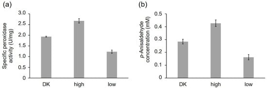 Comparison of the PsaPOX variants regarding their peroxidase and alkene cleavage activity. (a) Specific peroxidase activity. Values are the average of triplicate measurements using three independent replicates with standard deviations shown as error bars (b) p-Anisaldehyde concentration after bioconversion of trans-anethole (6.7 mM) using 0.25 mg/mL PsaPOX variant in the presence of 25 mM MnSO4, 100 µM H2O2, and 50 mM sodium acetate buffer pH 3.5 for 16 h at RT and 200 rpm. Values are the average of duplicate independent experiments with standard deviations shown as error bars. DK: PsaPOX_DK; high: PsaPOX_high; low: PsaPOX_low.