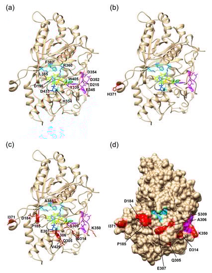 The eleven amino acid exchanges in PsaPOX_low were mostly positioned at the surface of the enzyme (Figure 7c,d). However, one mutation (V388A) was located in the heme cavity at distances of 6, 7, and 10 Å to the conserved residues F387, R360, and D196 of the hydrogen binding pocket, respectively (Figure 7c). The exchange of valine to the smaller alanine may have caused a conformational change in the hydrogen binding pocket, which could explain the lower activity of the P. sapidus strains containing the PsaPOX_low enzyme. Furthermore, most of the detected mutations (G184D, Q185P, L305Q, G306A, A307E, A309S, N314D, N350K, and S371I) led to a polarity change, which may have resulted in a rearrangement of the three-dimensional protein structure and therefore to a lower protein stability and activity. The change of enzyme activity and stability by conformational changes is known from the literature [,,]. Another hypothesis was that the substrate access to the heme cavity was complicated by several mutations (G184D, Q185P, L305Q, G306A, A307E, and A309S), which mostly increased the steric hindrance near the substrate entrance (Figure 7d), as assumed in the case of two other DyP-type peroxidases [,]. Furthermore, a negative charge was added by the exchange of glycine to aspartic acid at position 184 (pI of Asp: 2.98 []; pKa of Asp: 3.7 []), which probably aggravated the accommodation of the anionic substrate ABTS. Interestingly, position 371, which was mutated in the PsaPOX_high variant (S371H), was also mutated in PsaPOX_low (S371I). This indicated that the position is important for the activity of PsaPOX, despite its remote location in the predicted protein structure model (Figure 7b,c). X-ray crystallography will be necessary to ascertain the actual protein folding at this position. Point-mutation studies could be performed to ascertain the influence of position 371 on the enzyme activity as part of a follow-up study.