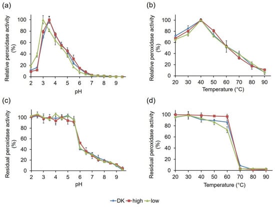 Influence of pH and temperature on activity and stability of the PsaPOX variants. (a) pH optimum and (b) temperature optimum. Relative peroxidase activity was defined as the percentage of activity detected with respect to the highest activity of the corresponding enzyme variant in each experiment. pH stability (c) was determined after incubation of PsaPOX in Britton–Robinson buffer, ranging from pH 2.0 to 9.5 for 1 h at RT, and temperature stability (d) was determined after incubation at 20–90 °C and pH 3.5 for 1 h. Residual activities were determined at pH 3.5 and 40 °C. Values are the average of triplicate experiments with standard deviations shown as error bars. DK: PsaPOX_DK; high: PsaPOX_high; low: PsaPOX_low.