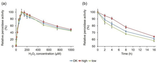In addition, the hydrogen peroxide dependency of the three PsaPOX variants was compared (Figure 9a). The enzymes shared a similar behavior and reached their activity optimum in the presence of 100 µM, as previously described for PsaPOX_DK []. In the presence of higher hydrogen peroxide concentrations, a continuous activity decrease was observed as result of suicide inhibition. This was also observed for other DyPs [,] and most likely the result of the formation of an inactive oxidative state of the heme in the enzyme’s active site [,,,].